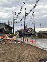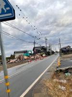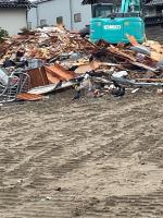 解体された家の中から出てくる食べ物をねらって、カラスとトンビが集まっています。