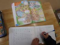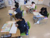 1年生が算数の時間に、今まで習ったたし算やひき算を使ってお話問題を作っています♪