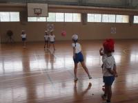 2年生が体育の時間の初めに「シャトルボール」をしていました。