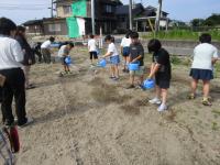 今朝は、全校の子供たちでコスモス畑の水やりの日です♪