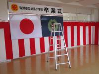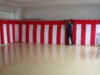 校務員さんが、卒業式の会場となる音楽室の飾りつけテストをしていらっしゃいます。