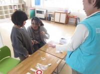 プラスチックで作られた硬貨で、お客さんとお店の人の役割になってやり取りをしています♪