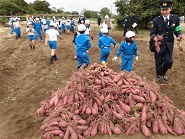 警察の方や青年福祉委員の方々、地域の方々と一緒にを掘り始めると、とても立派に育ったサツマイモが出てきて、たくさん収穫することができました。