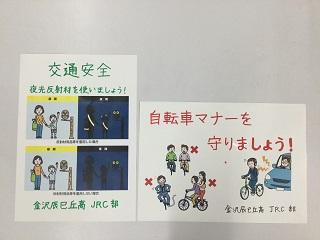 反射バンド、または、反射タスキと交通安全県民運動のチラシを配布しました。その反射材には、悲しい事故が1件でも減って欲しい、という思いを込めた部員の手書きメッセージを添えました。