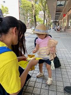 初めて参加した活動だったため緊張して疲れましたが、たくさんの方が募金してくださり、また「頑張ってね」「暑いのにご苦労様」など、温かいお言葉をたくさんいただきました。