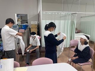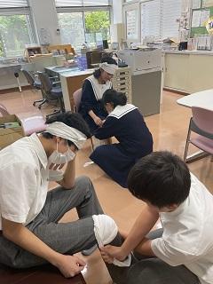 また、来週の救急法競技大会に向けて、三角巾を用いた傷の手当ての練習をしました。
