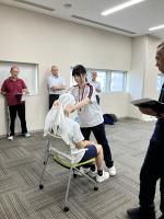 競技内容は、三角巾を用いた頭部と膝の怪我の応急手当を行い、その仕上がりやタイムなどから審査されるというものでした。参加した部員は緊張しながらも、丁寧に手当てを行っていました。