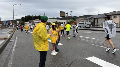10月26日金沢マラソンボランティアに参加しました。雨の中走るランナーに元気なかけ声をかけていました。