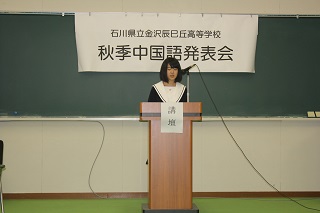 9月22日、本校アクティブラーニング教室で、本年度の中国語秋季校内発表会が行われました。10名の発表者が課題文暗唱発表と及び自作スピーチ発表を行い、日頃の練習の成果を発揮しました。中国語の難しい発音を克服し、みんなの前で堂々と発表することができました。今回の発表会は、12月に福井県で行われる北陸地区中国語発表会の出場選手を決める大事な発表会でした。初級リーディング部門3名、中上級弁論部門2名計5名の生徒が、地区大会に参加します。大会に向けてこれからも発音や表現力を磨き、一層努力し、成長して欲しいと思います。