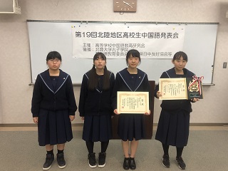 北陸地区の中国語を学んでいる高校生が4つの部門に分かれ、日頃の努力の成果を発表しました。本校代表4名が2つの部門に出場し、2つの賞に輝きました。