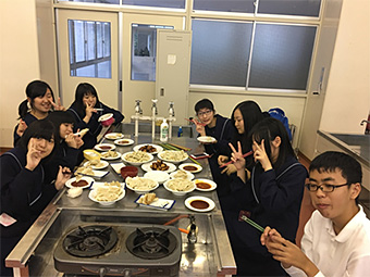 5月20日、中国語部の部員は、調理室で餃子作りを体験しました。初めて自分たちの手で餃子を包んで焼いたので,とても新鮮な感じがしました。皆で手を動かしながら外国の食文化を学ぶ良い機会となりました。出来立ての焼き餃子を日頃お世話になっている先生方にも配って食べていただき、好評を得て、とっても嬉しい様子でした。今回は、竹の子、ニラ、玉ねぎ、卵、豚ミンチなどを具にして、中国北方の伝統的な家庭料理の味に挑戦しました。とっても楽しいパーティーでした。