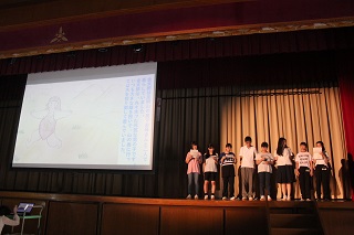 日本の昔話「一寸法師」を中国語に編集し、部員達が自らマンガを作成し、中国語で発表しました。流暢で綺麗な発音の中国語でした。