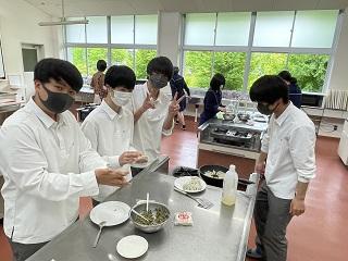 5月20日、中国語部の部員は、調理室で餃子作りを体験しました。初めて自分たちの手で餃子を包んで焼いたので,とても新鮮な感じがしました。皆で手を動かしながら外国の食文化を学ぶ良い機会となりました。出来立ての焼き餃子を日頃お世話になっている先生方にも配って食べていただき、好評を得て、とっても嬉しい様子でした。今回は、竹の子、ニラ、玉ねぎ、卵、豚ミンチなどを具にして、中国北方の伝統的な家庭料理の味に挑戦しました。とっても楽しいパーティーでした。