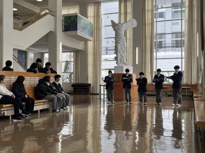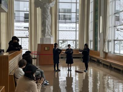 雪がたくさん降った日のお昼やすみに、ランチタイムコンサートを開きました。 女声三部合唱で「村の鍛冶屋」、男声四部合唱で「柳川風俗詩」から「梅雨の晴れ間」を演奏しました。 外は寒いけれど、温かな歌声でニケ像ホールが包まれました。