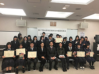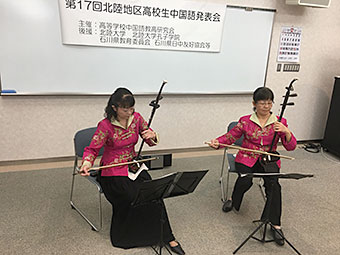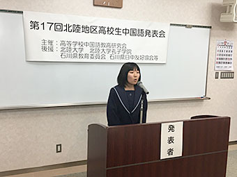 去る2016年12月23日、金沢リファーレで行われた「北陸地区高校生中国語発表会」にて、中国部部長の上寺美菜峰さんが「中級スピーチ部門」で第一位に輝き、全国大会審査出場となりました。おめでとうございます!北陸大会の頂点に立った演説中の上寺さん出場者、審査員の方々と記念撮影(上寺さん、前列右端)審査結果を待つ間の二胡の演奏激戦となった初級リーデング部門と中級リーデング部門では、今回は残念ながら入賞になりませんでしたが、「来年の大会までに精一杯頑張ります!」とみんなで誓いました。