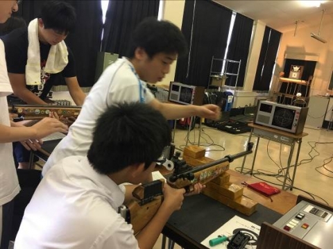 ライフル射撃部員がビームライフルの手ほどきをしました。かなり、本気になっている人がいました。