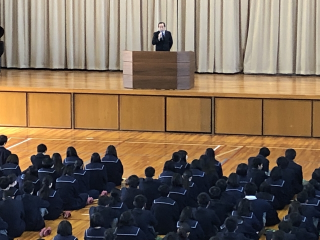 3学期の始業式が行われました。学校長より、センター試験が目前に迫った3年生へは、最後の最後まで粘り強く取り組むことの意義について、1・2年生へは、失敗することを恐れず色々なことにチャレンジすることの大切さについて訓話がありました。続けて、今年はオリンピックイヤーということもあり、卓球女子の平野選手が前回オリンピックで代表メンバーから外れながらも「次こそは」という目標を持ち続けて努力を積み重ねてきたことを引き合いとして、「今年の目標をぜひ立てるように」と強く呼びかけがありました。