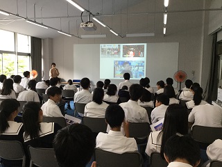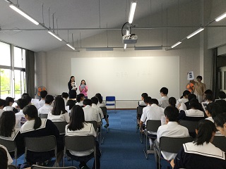 本校は、二年生から選択科目として中国語授業を最大12単位継続学べる県内唯一の高校です。一年時に中国や中国語について簡単な説明が行います。これは、本校の中国語オリエンテーションです。