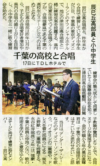 金沢辰巳丘高校合唱部20名と金沢市内や福井県からの小中学生12名のメンバーと共に練習しています。現在、小中学生のメンバーを募集中です。一緒にディズニーランドオフィシャルホテルで演奏しませんか!!