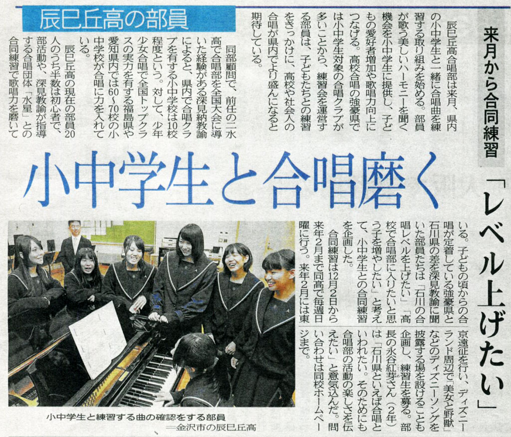 金沢辰巳丘高校合唱部20名と金沢市内や福井県からの小中学生12名のメンバーと共に練習しています。現在、小中学生のメンバーを募集中です。一緒にディズニーランドオフィシャルホテルで演奏しませんか!!