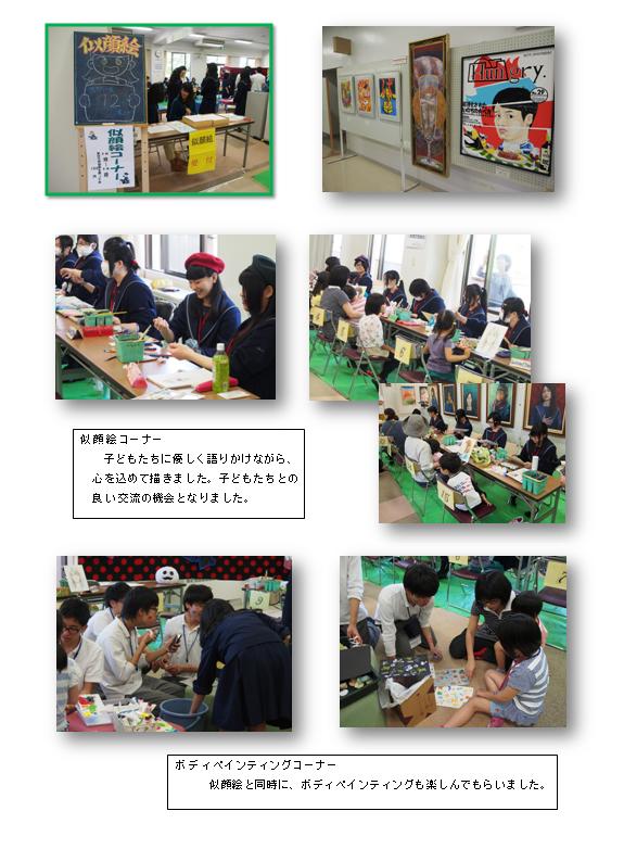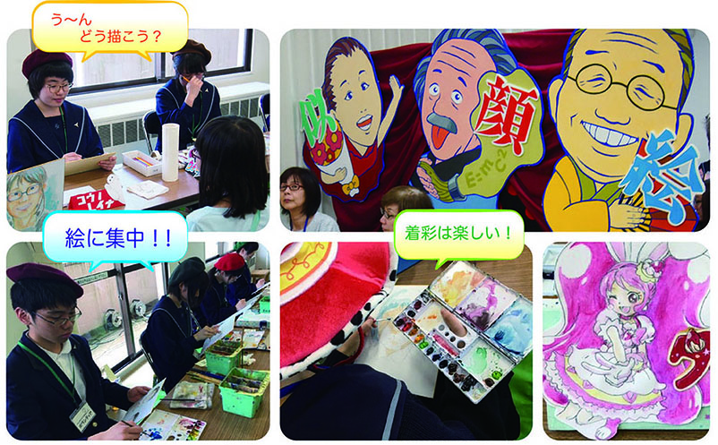 本校美術専校3年生による似顔絵コーナーが設けられ、200名余りの子どもたちの似顔絵を描くとともに、本校生徒の作品を展示し、多くの家族連れの方々に見ていただきました。