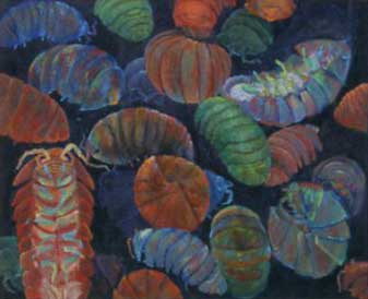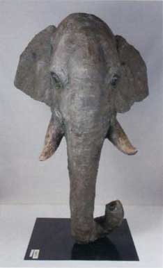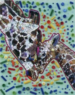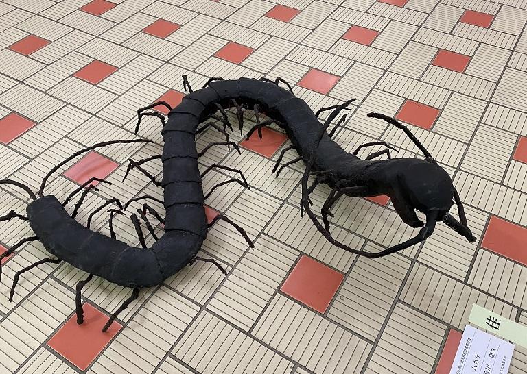 新聞紙とガムテープで作った動物の立体造形。ヤモリの展示方法が妙にリアルです。