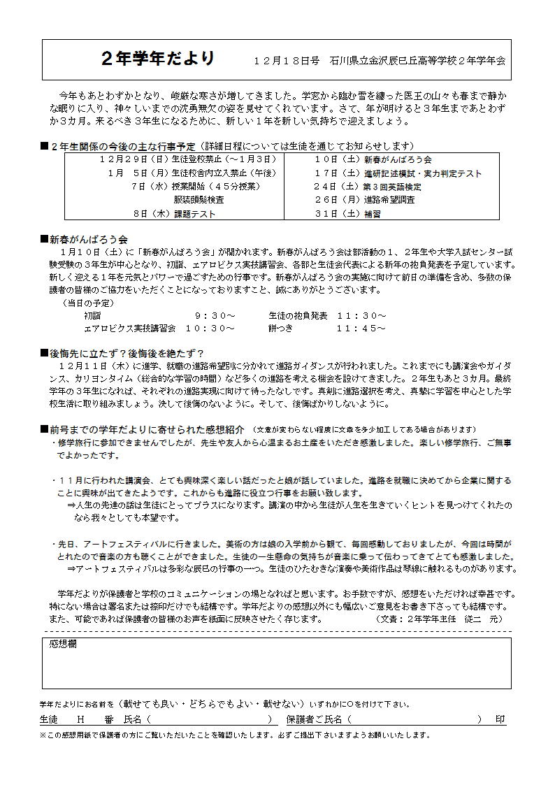 2年学年通信を発行しました。ぜひご覧ください。(R6.12.17)