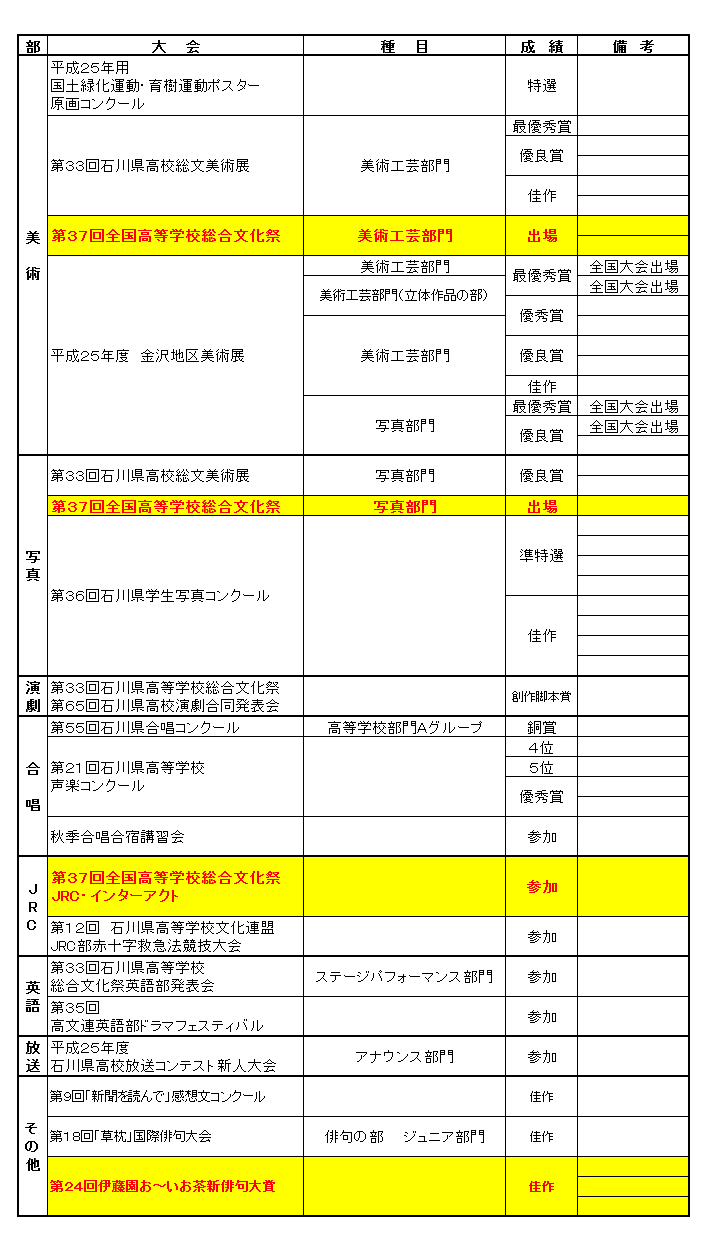 美術、写真、演劇、合唱、JRC、英語、放送、その他