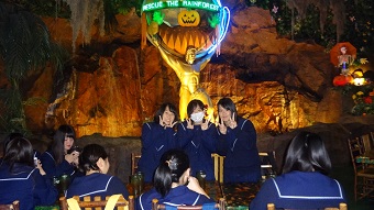 午後は、イクスピアリで昼食後、楽しみにしていたディズニーランド。当日は気温は12月並みの12度、しかも雨でとても寒く、アトラクションを楽しむには最悪のコンディションでしたが、生徒たちはこの寒さをもろともせずに、思い思いのアトラクションや買い物を楽しんでいました。