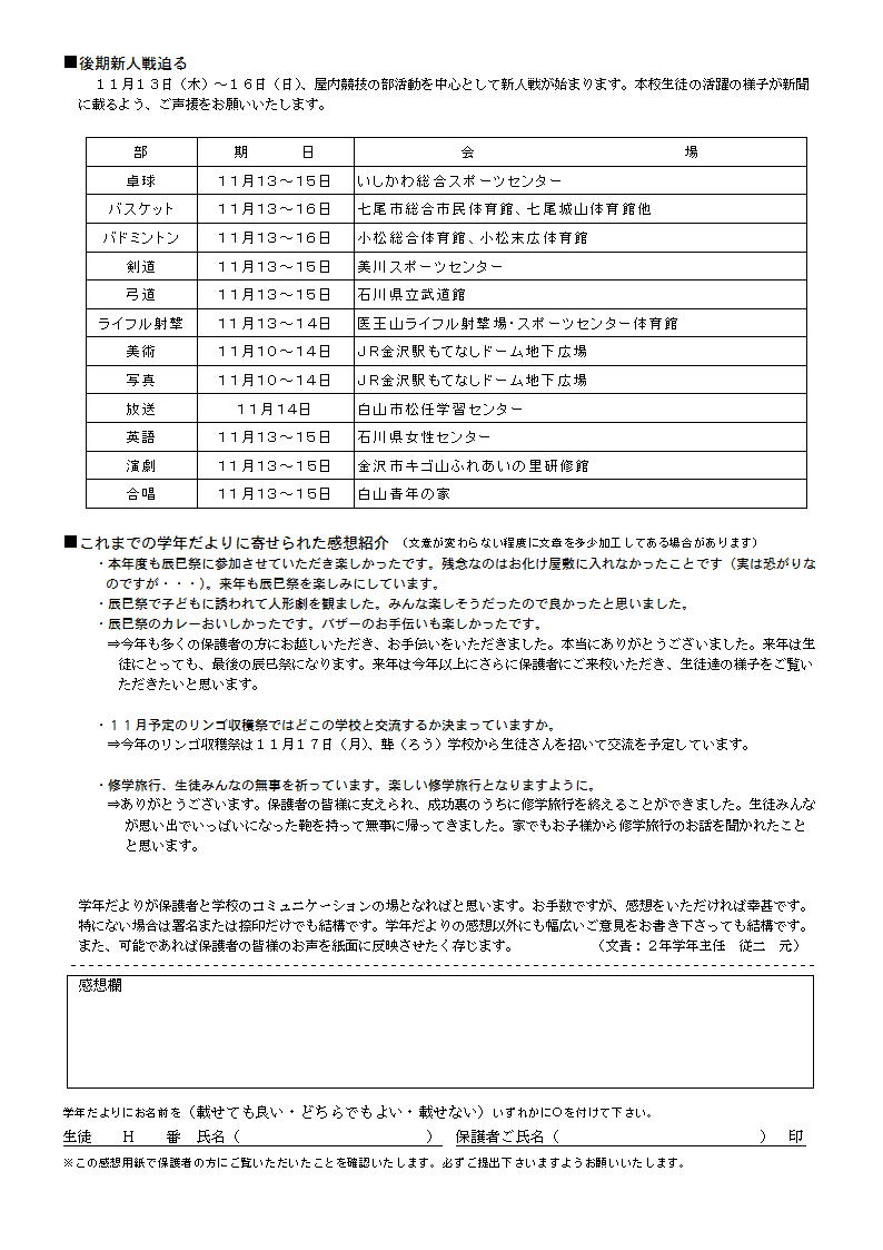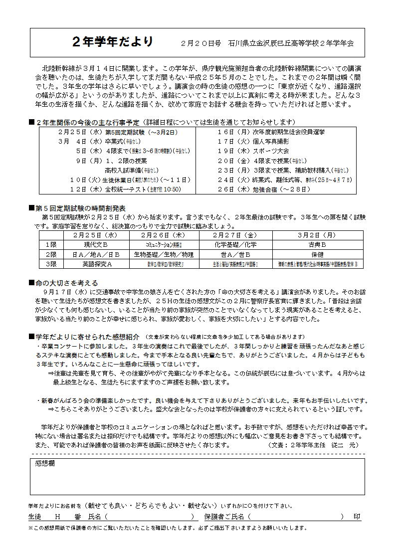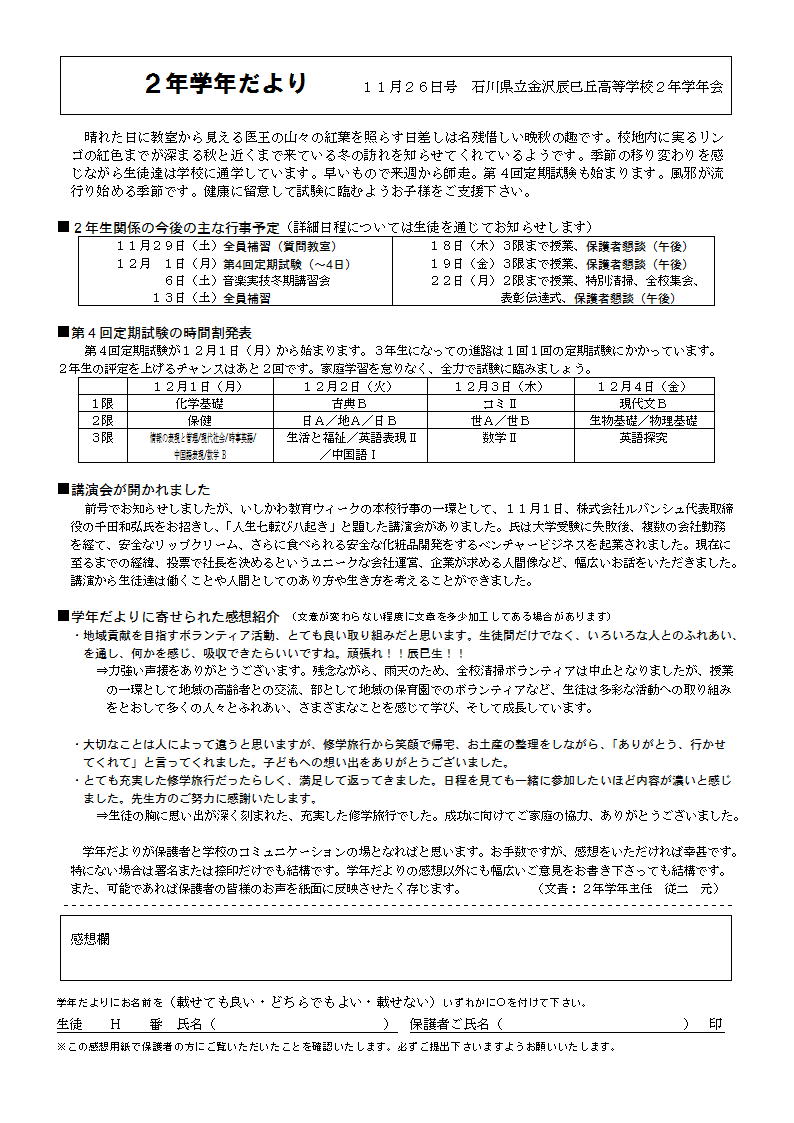2年学年だよりを発行しました。保護者には18日(木)、19日(金)、22日(月)の保護者懇談時にもお渡しいたします。