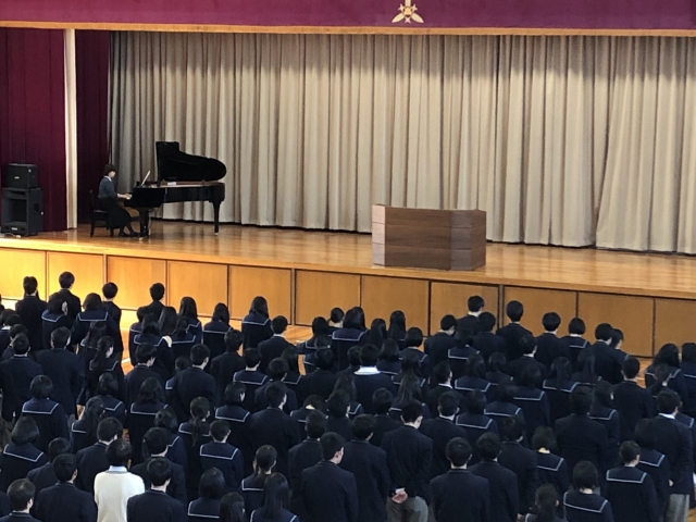 12月21日(金)朝は冷え込んだものの日中は日も差し込む陽気の中、2限後、特別清掃を行ったあと、2学期及び今年の締めくくりとして終業式を実施しました。式前の表彰伝達式では、登壇した大勢の生徒らの健闘を皆でたたえ、今後の活躍に期待を込めました。終業式で学校長からは、今年1年を振り返り、世の中の出来事や自己の成長を確認し、少しずつでもいいから自分で考え、出来ることを増やし、自己の能力を確実に伸長させて欲しいとのメッセージが伝えられました。学校長訓話後、「大きな明日へ」を皆で歌い、式を終えました。式後、生徒指導課から、高校生であることをしっかりと自覚し、周囲に流されず、自分でしっかりと考えて行動するようにとの諸注意を受けました。危険な目に遭うことなく、少しでも自己を成長させて、3学期始業式(1月8日(火))に臨みましょう。
