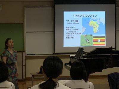 小堀香奈さんは本校卒業後、大阪音楽大学を卒業。高等学校や専門学校で講師を務めらた後、青年海外協力隊に参加され、アフリカ、ウガンダ共和国の小学校で音楽教師として2年間活動されています。帰国後は、小学校の音楽講師をされながら、県内の学校で講演活動なども行っていらっしゃいます。