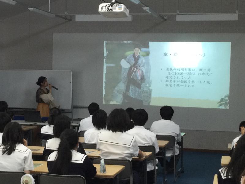 7月2日(火)期末試験最終日の進路講話終了後、1年生普通コースの生徒を対象に中国語オリエンテーションが行われました。普通コースでは2年生で中国語を選択して学習することができ、その選択の参考とするためです。高大連携校の北陸大学より、中国人留学生が2名来校し、流ちょうな日本語で、中国の文化(民族衣装・料理)や外国語を勉強する意義についてお話してくださいました。生徒たちは興味深そうにお話を聞いていました。