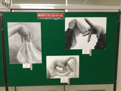 4月29日(金)に、毎年恒例の校内デッサンコンクールが行われました。今年度最初の会で、1年生は初体験になります。今回のモチーフは「タオル(白)」と「手」。生徒の皆さんは色々なアイデアで素敵なタオルと手を描いていました。審査の結果、最優秀賞は33H川崎さん、優秀賞には同じく33Hの藤本さんと瀬戸さんが選ばれました。