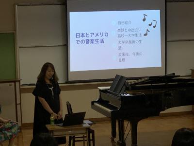 1年高柳さんによるピアノ演奏、3年今村さんによる歌唱のミニコンサートの後、プロの先生方によるマンツーマンのレッスン体験とソルフェージュ体験がありました。