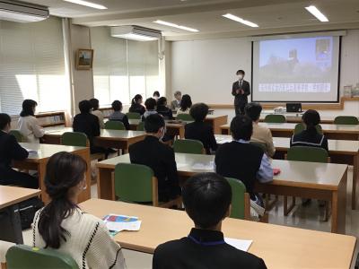 10月26日の5限目と6限目に、本校アクティブラーニング教室で北陸大学連携の模擬授業を行いました。本校2年生グローバルコースの生徒21名が、北陸大学コミュニケーション学部田中教授の講座を受けました。5限目は、あるトランプ・ゲームを通してグローバル化人材に必要なことを考える取り組みをしました。その後、北陸大学3年生の留学体験談を楽しく聞きました。6限目は、新聞記事でグローバル化の成功例を読み、どんな需要が必要とされるのか、自分の強みを生かしてどのように売り出しているかなどについて4人グループに分かれて話し合いました。とっても素晴らしい講座で本校生徒はワクワクして授業を受けていました。大学生活に対する憧れもあり、生徒たちはこれからの国際社会への興味が大いに湧いたようでした。