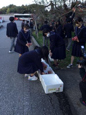 晴天に恵まれた11月16日(火)の7限目に3年生によるりんご収穫がありました。31H、32H、33Hの順番に実施しました。りんごを手で優しくもぎ取って発泡スチロールの箱に入れていきました。あっという間一つの箱はりんごで一杯になりました。何百個というたくさんのりんごを収穫することができました。りんごの木の周りは生徒の活気で満ちあふれ、生徒たちは本当に楽しそうでした。