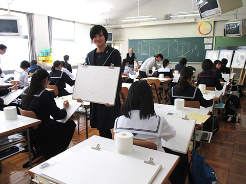 本校の美術専攻3年生がデモンストレーターとして中学生と同時に実際にデッサンを描いたり、講師として本校卒の美大生も指導にあたるなど、参加した中学生にとって有意義な講習会となったようです。