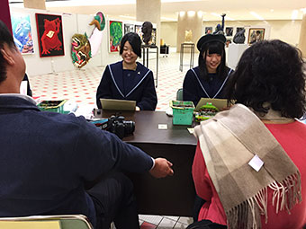 会場の石川県本多の森庁舎2階“まなびストルーム”には、幼児からご年配の方までが訪れ、本校美術専攻3年生7名が40名の方の似顔絵を色紙に即興で描きました。描き上げるまでの約20分間、会話を楽しみながら、和やかな雰囲気の中、楽しい時間を過ごすことができました。