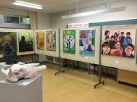 アートコラボレーションの第三弾は、犀生中学校です。犀星中学校2階のホール上になっているスペースに、本校生徒の作品を展示させていただきました。
