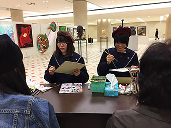 会場の石川県本多の森庁舎2階“まなびストルーム”には、幼児からご年配の方までが訪れ、本校美術専攻3年生7名が40名の方の似顔絵を色紙に即興で描きました。描き上げるまでの約20分間、会話を楽しみながら、和やかな雰囲気の中、楽しい時間を過ごすことができました。