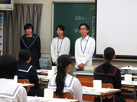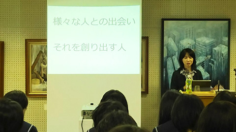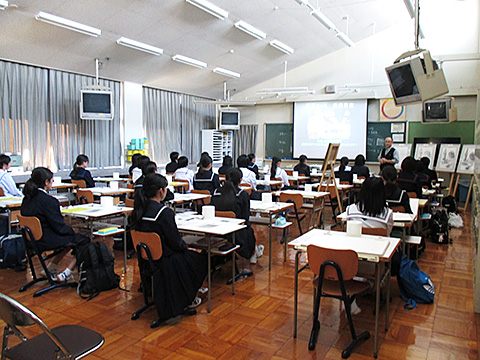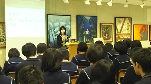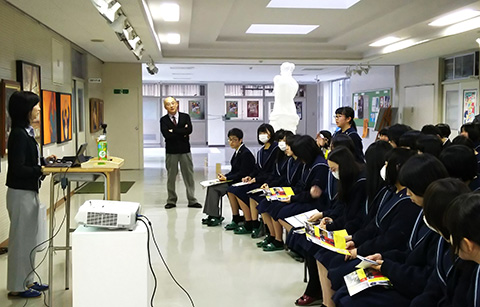 金沢美術工芸大学教授 桑村佐和子先生をお招きして、美術講演会を行いました。講演は「美術学習の意義と求められる創造力のある人材とは」という演題で、美術の学習をすることでどんな力がつくのか、それは将来どのように活かされるのか、また、変化の激しい現代社会で求められる創造力ある人とは、などについて美術専攻生全員がお話を聴きました。途中、金沢美大や美大生のユニークな行事やエピソードなどの紹介もあり、楽しく、かつ意義深い講演会でした。