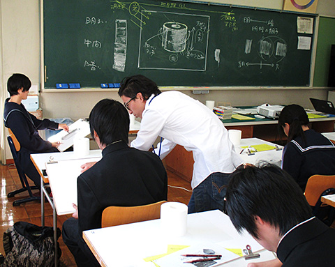 また期間中、兼六中学校美術部と本校美術部が鉛筆デッサンを題材に実技交流を行い、立方体をモチーフに透視図法を活かしながらデッサンの基本と手順を学習し合いました。
