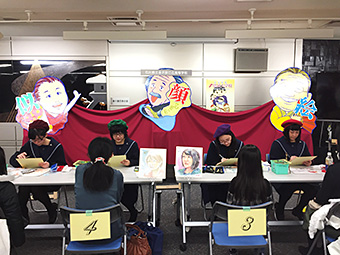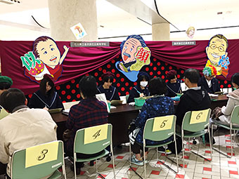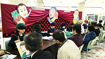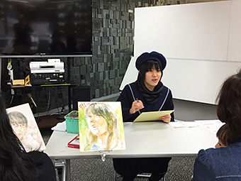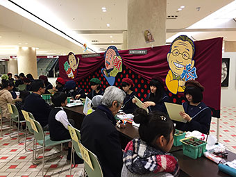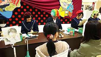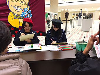 会場の石川県本多の森庁舎2階“まなびストルーム”には、幼児からご年配の方までが訪れ、本校美術専攻3年生7名が40名の方の似顔絵を色紙に即興で描きました。描き上げるまでの約20分間、会話を楽しみながら、和やかな雰囲気の中、楽しい時間を過ごすことができました。