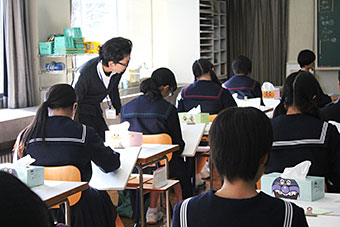 美術交流では本校教員指導のもと、鉛筆デッサンを題材に、基礎的な技術を本校生徒がアドバイスなどしながら交流を深めました。
