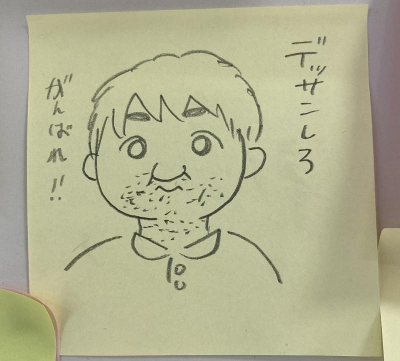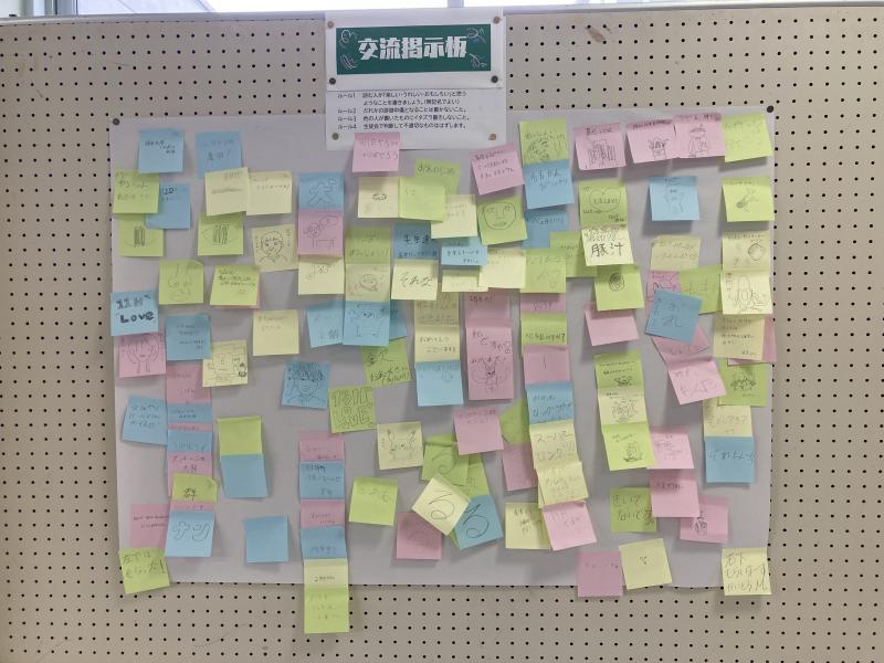 今年の前期生徒会役員の発案で設置した交流掲示板。メッセージやイラストなどを付箋に書いて貼りつけることができます。