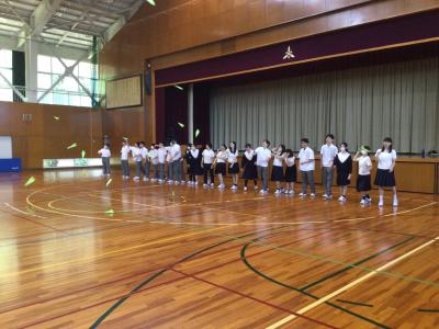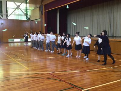 今年は本校創立40周年ということで、記念になる新しい行事をやりたいという前期生徒会の発案で7月11日(金)に紙飛行機選手権大会が行われました。クラスごとに色の違う紙飛行機に自分たちの願いを書き、できるだけ遠くへ飛ぶように思いを込めて紙飛行機を飛ばしました。クラスごとの予選、各学年代表を決める準決勝を勝ち進み、優勝者は飛距離18m95cmでした。(教員も参加しました。もちろん校長先生や教頭先生もです。)