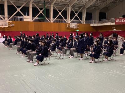 今年度も早いもので終業式の日を迎えました。まん延防止等の措置は解除されましたが、引き続き感染症対策を講じながらの実施となりました。終業式に先立ち来年度の生徒会役員任命式、表彰伝達式、皆勤者の表彰、図書利用の多読者の紹介がありました。終業式では校長先生が1年を振り返ることを通して「過去は変えることができないが、未来は過去の経験・反省を生かして切り拓くことができる。」と今後の活動に期待を込められました。また、退任される赤尾教頭先生からは、「生きていく上での様々な人や物事との出会いには必ず意味がある。」「苦手であるような出会いは、自分自身を変えるチャンスである。」という前向きな指針をいただきました。