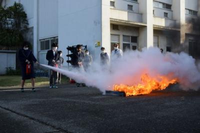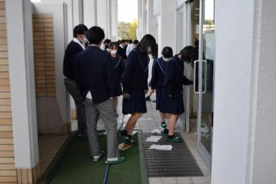 避難訓練を実施しました! 投稿日時 : 2021/10/21 tatsuh 本日の7限目に何とか天候にも恵まれ避難訓練を実施できました。訓練は地震発生に伴い、2次的に火災が発生したという想定で行いました。LHの時間帯のため、クラス単位で移動・集合が可能でありましたが、生徒たちは短時間で避難・点呼が完了することができました。教頭先生の講評と(株)アロテックさんによる消火器の取り扱いの説明を受けた後、生徒代表3名、教職員代表3名による消火体験を行いました。終了後は校舎内へ汚れを持ち込まないようエコ委員が活躍してくれました。 Tweet