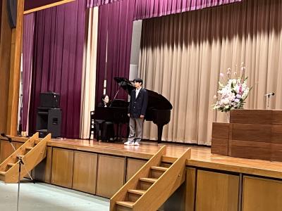 入学式につづき、合唱部生徒による学生歌の紹介と新入生代表による記念演奏を聴きました。